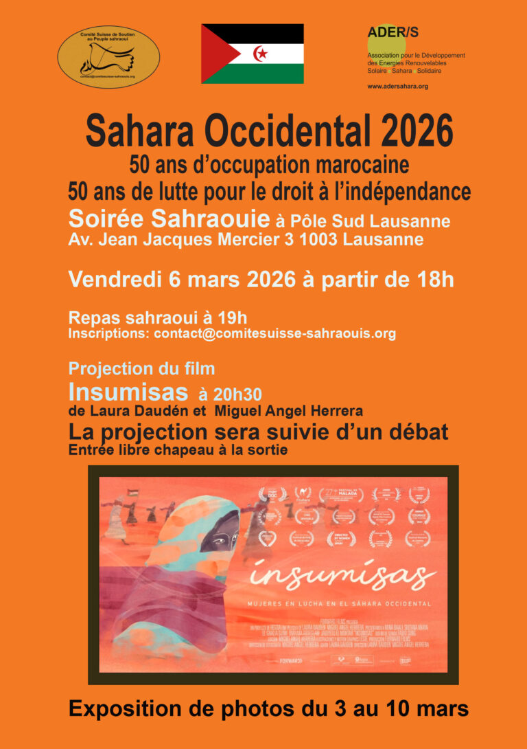 20h30 - Projection du filme INSUMISAS Dès 21h00 Présentation de la situation géopolitique actuelle des Sahraouis vous sera présentée par Omeima Abdeslam ancienne représentante du Front Polisario à Genève,